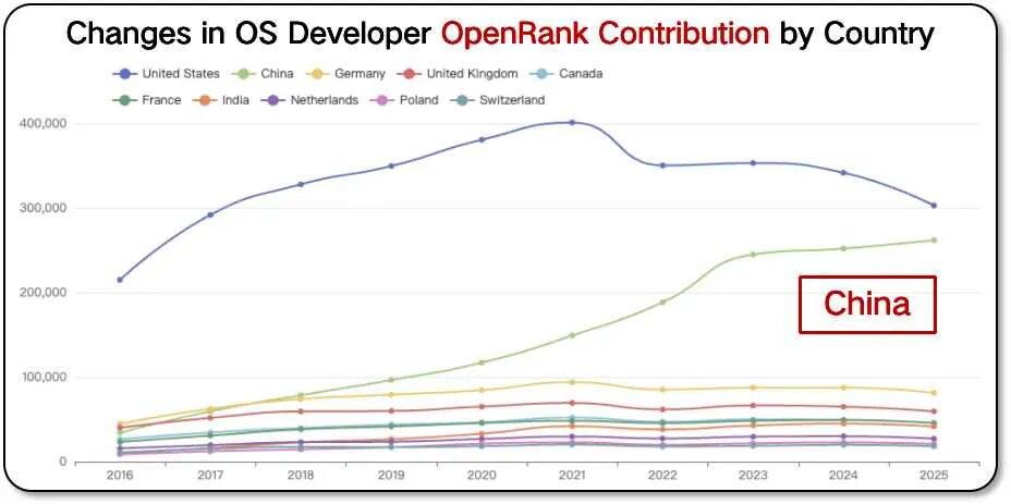 一、由奇点智能研究院出品、联合国咨商开源创新专委会编制的《2025 全球开源发展报告(预览版)》,全面衡量全球开源生态的发展格局。数据显示,美国仍是开源生态的核心力量,中国则保持高速增长,目前拥有约 400 万活跃开源开发者,总开发者数量达 1200 万,稳居全球第二。在技术演进方向上,AI 大模型、云原生基础设施、前端与交互技术,以及编程语言与开发工具链,正成为推动全球技术变革的四大核心驱动力。在高影响力开发者这一关键指标上,美国仍以绝对优势位居第一。但中国表现亮眼:从 2016 年的 3 位高影响力开发者,跃升至 2025 年的 94 位,实现近 30 倍的增长,数量跻身全球第二梯队,展现出中国在核心技术贡献和国际开源话语权方面的快速崛起。