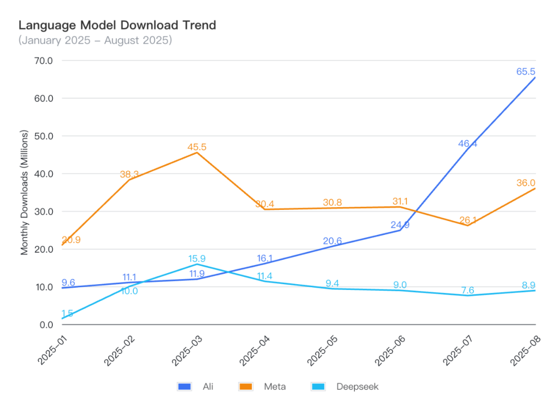 在多模态模型方面,我们可以看到,OpenAI 的 CLIP 模型曾占据领先地位,但在 7 月下载量出现大幅下滑。而阿里巴巴的 Qwen-2.5-VL 系列模型则展现出稳健的增长态势,8 月的阿里巴巴的多模态模型下载量甚至超过了 Google。