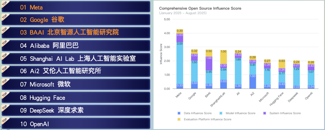 二、《大模型技术体系开源影响力榜单》。从数据、模型、系统和评测四个方面展开评估。模型榜单前十名主要由中美机构占据,其中 Meta、阿里巴巴和谷歌位列前三,DeepSeek 也表现出强劲影响力。在数据集方面,Ai2、上海人工智能实验室和谷歌位居前列;系统层面,智源在算子库、编译器和生态建设上贡献突出,Meta 和谷歌保持领先;评测环节,上海人工智能实验室、Hugging Face 和北京智源人工智能研究院排名前三。综合榜单则由 Meta、谷歌和北京智源人工智能研究院(BAAI)领跑。报告指出,大模型竞争的关键已不止于单一模型,而在于完整生态的打造。
