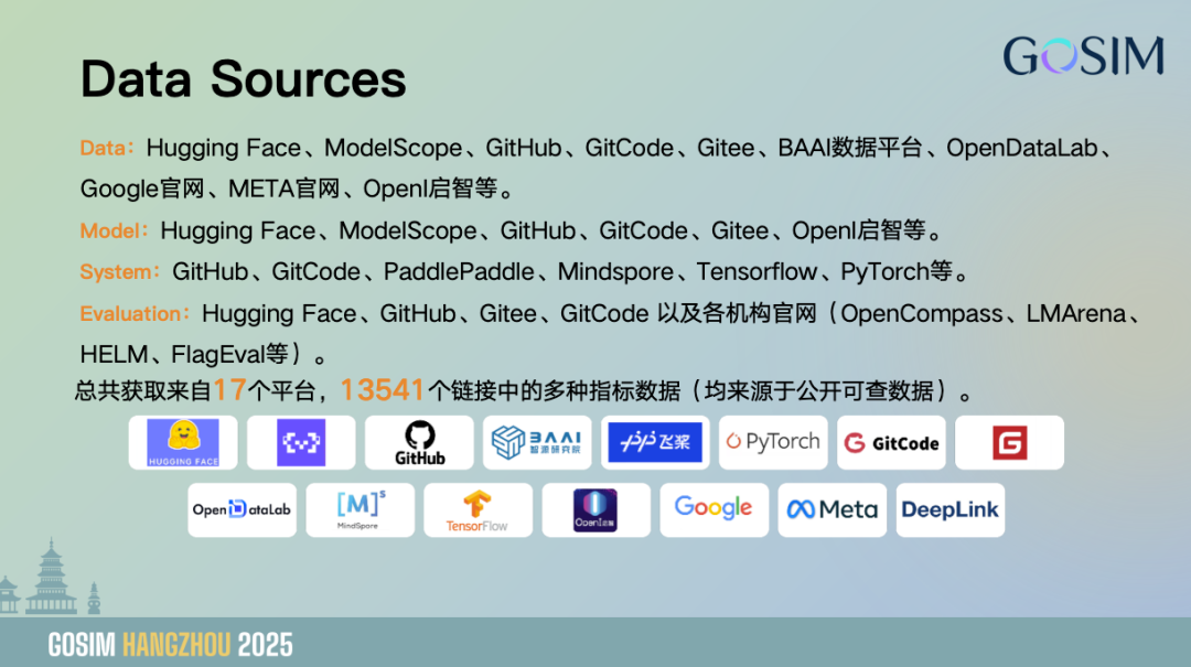 榜单主要由四个部分组成,分别是数据、模型、系统和评测。其他三个都很容易理解,而系统实际上是反映了生态,包括算子库、并行训练及推理框架等。整个 AI 开源不仅只是大模型,它需要的更多是系统性的生态服务,所以我们在这里特别增加了一个系统的榜单。这份榜单中所有的数据均来自公开可查的渠道,总共选取了全球范围内头部的 25 家公司作为代表,引用了总计 1529 个数据集、4410 个模型、719 个算子、58 个评测平台、 13541 个链接,时间覆盖 2025 年 1 至 8 月。这不仅是一份榜单,更是对大模型技术体系的整体性和多样性的集中呈现。希望通过这份榜单,向大家展示全球领先企业在开源领域的深耕与贡献,共同推动产业的繁荣发展。