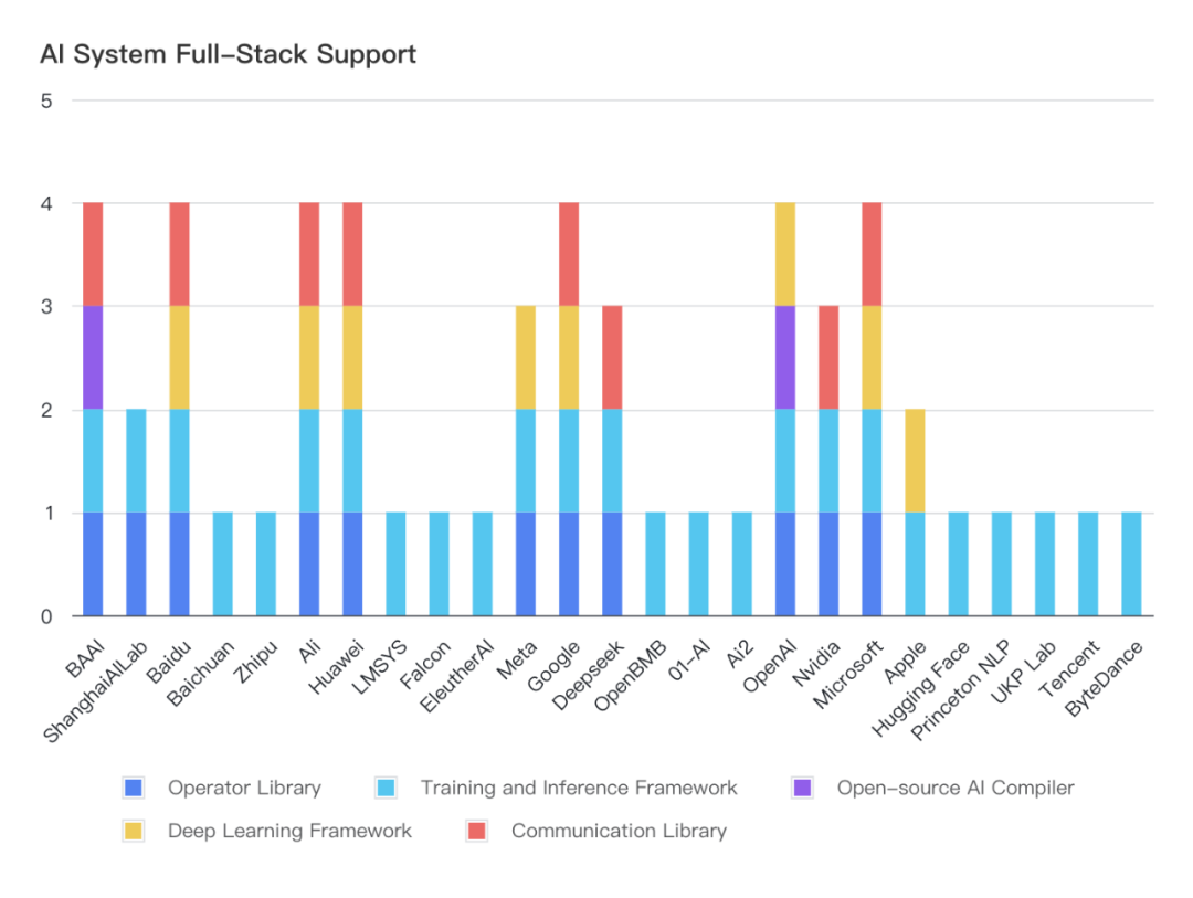 具体来看,在算子库和并行训练及推理框架方面,Meta 和谷歌优势显著。而在通信库和开源 AI 编译器方面,智源(BAAI)则表现突出。