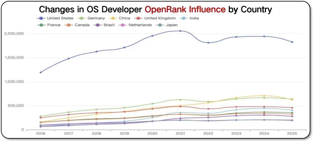 当前,全球开源生态呈现出持续扩张与区域格局多样化演变趋势。印度和中国的增长速度显著,十年间印度达到 6 倍增长,中国达到 3 倍增长,巴西作为拉美地区代表,增幅超过 5 倍。在 OpenRank 贡献度格局中,美国 2021 年达到最高点后逐年下降,中国贡献度十年间大幅上升,其余国家则稳步增长。而在影响力格局中,美国始终保持领先,德国稳居欧洲第一,中国、印度快速上升,巴西与日本作为区域代表体现出全球区域共同发展态势。