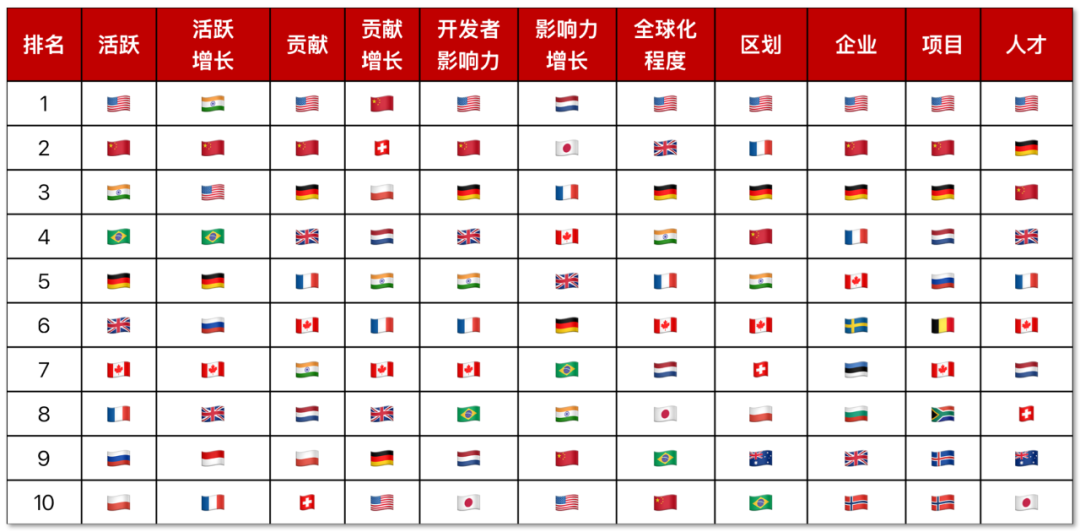 总的来说,全球开源生态持续繁荣,美国还是领先全局,综合实力最强,中国和印度在加速发展,贡献度、影响力增速显著,欧洲(以德法为代表)有非常深厚的基础,而拉美、东南亚也开始在开源里有贡献,就像十年前的中国一样。
