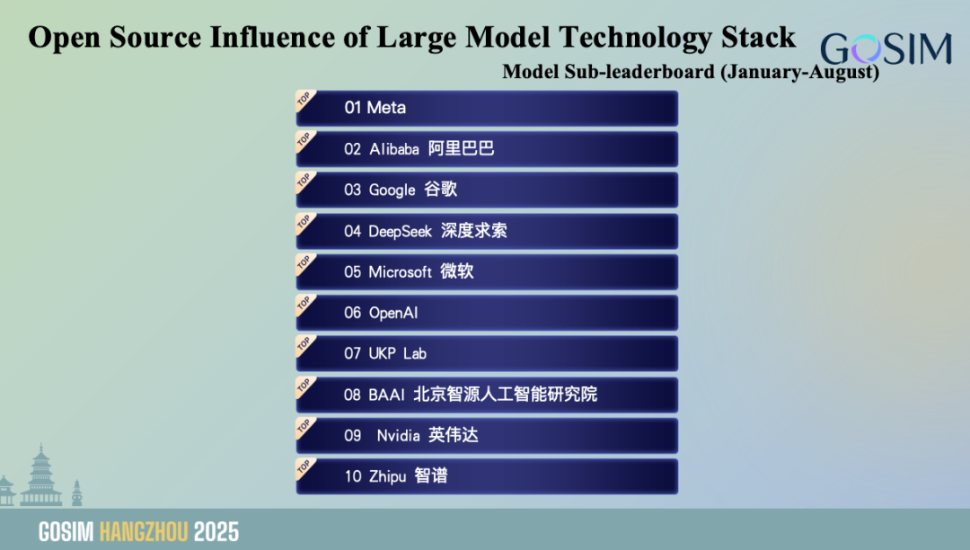 首先是模型的排行榜单 TOP10,以中美机构为主。我们可以看到 Meta、阿里巴巴和 Google 分别位列前三,同样起于杭州的 DeepSeek 也表现出非常强劲的影响力,整体呈现相对多元化的格局。