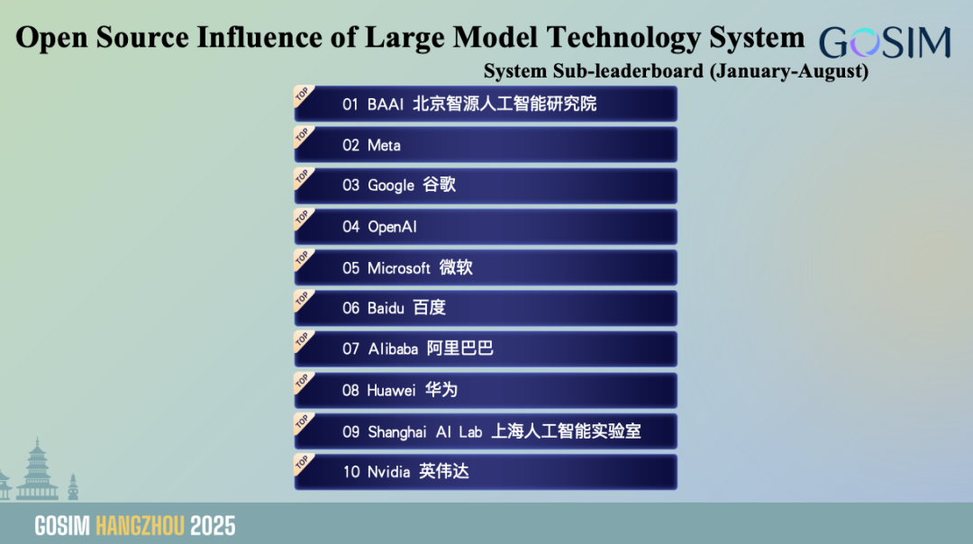 接着我们再看第二个榜单,围绕大模型展开。当前,大模型正以前所未有的速度重塑技术格局,而开源是其核心驱动力。我们这次发布的《大模型技术体系开源影响力榜单 (OSIR-LMTS)》,旨在客观评估大模型技术栈的综合开源影响力。这份榜单不仅是对现有技术的梳理,也是对未来趋势的预判,体现了我们对技术社区和产业发展的深刻洞察。