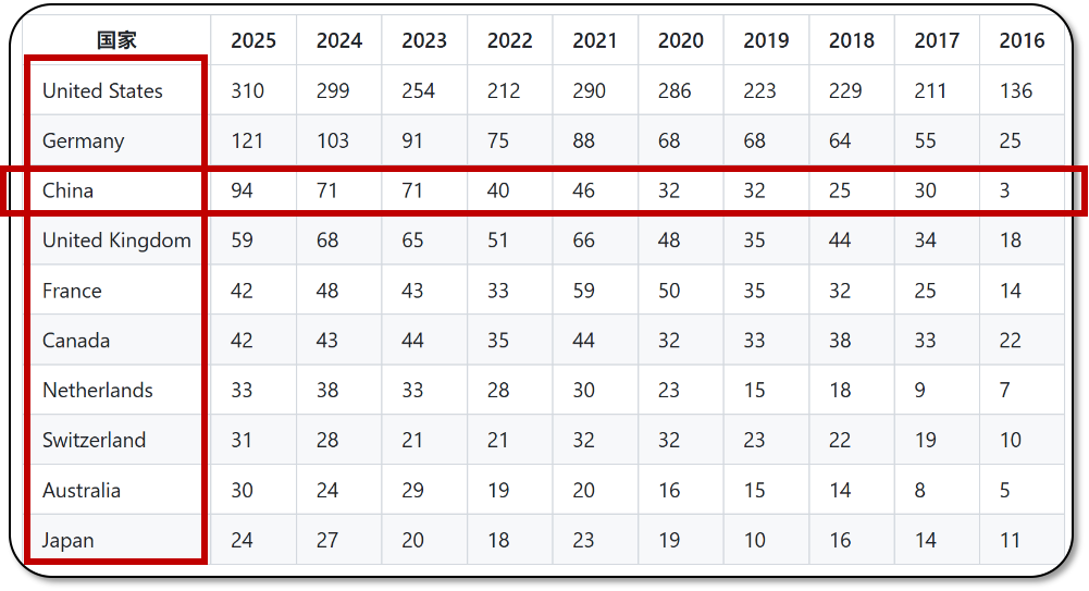 人才维度,开源最重要的还是人才,我们也从数据中能够观察到——谁是开源界最有影响力的人物?他们的代码被更多人去引用和使用。可以看到,美国依然持续领跑全球开源高影响力开发者,从 2016 年的 136 人增至 2025 年的 310 人,十年翻倍有余。中国则实现了跨越式的跃升,从 2016 年仅有 3 人飙升至现在的 94 人,增长超 30 倍,跻身 TOP3。而欧洲增长格局多年来则相对稳定,德国以 121 人位居全球第二。