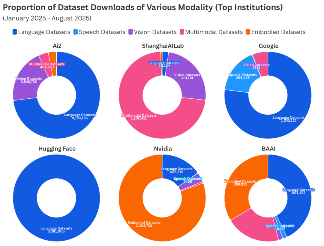 综合数据集的下载趋势我们能够发现,语言数据集在 1 月到 4 月间一直是下载的主力,纯视觉数据集的下载比例呈现快速下降趋势,具身数据集则增势显著,这充分表明,大模型数据生态正在从传统的单一模态向更具挑战性和应用前景的具身和多模态方向发展。