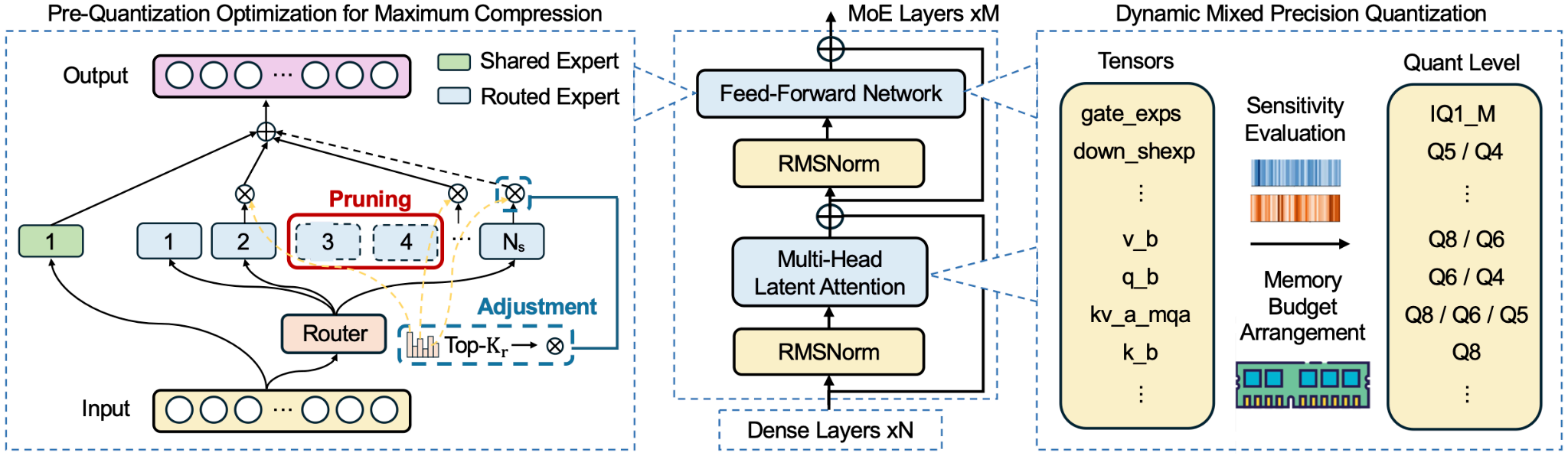该框架的核心思想是,压缩不是一个单一的步骤,而是一个环环相扣的流程。团队设计了一个由专家剪枝、激活调整与卸载、和混合精度量化三个阶段组成的协同系统。
