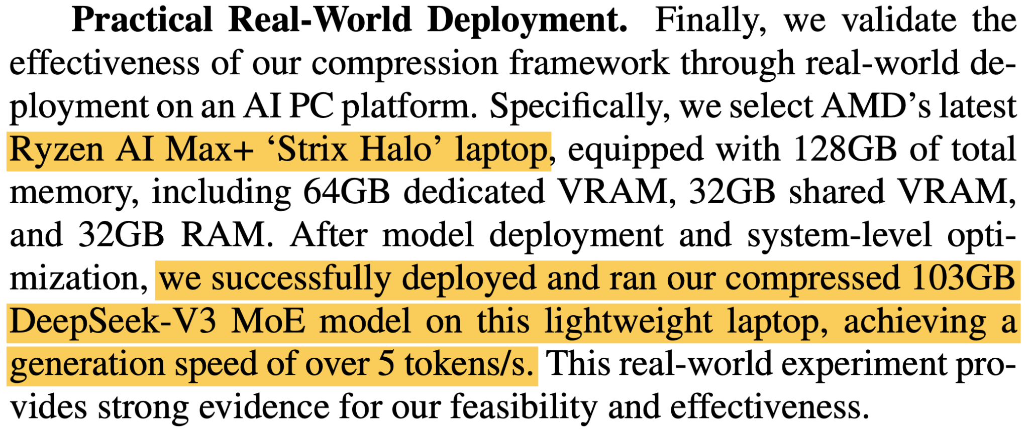 最引人注目的成果是,团队将 671B 参数的 DeepSeek-V3 模型(原始 1.3TB)压缩至 103GB。这不是一次理论模拟。团队成功在 128GB 内存的商用 AI 笔记本(AMD Ryzen AI Max+ "Strix Halo")上实现了该模型的本地部署和运行,并获得了 > 5 tokens /秒 的可用推理速度。据我们所知,这是 T 级参数的 MoE 模型首次在消费级 PC 硬件上成功运行。
