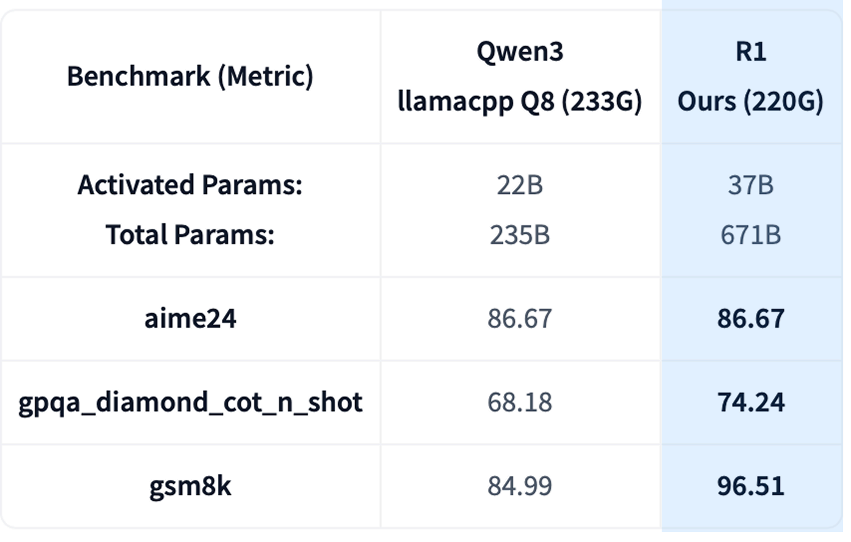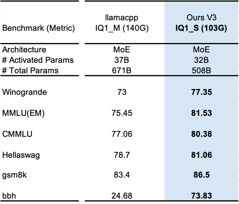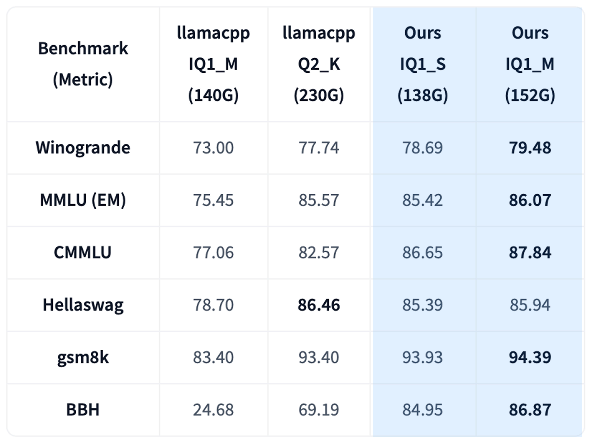 压缩不仅是为了“能跑”,更是为了“好用”。团队将他们的 103GB 压缩模型与标准的 140GB 统一低比特量化模型(llama.cpp IQ1_M)进行了基准对比。