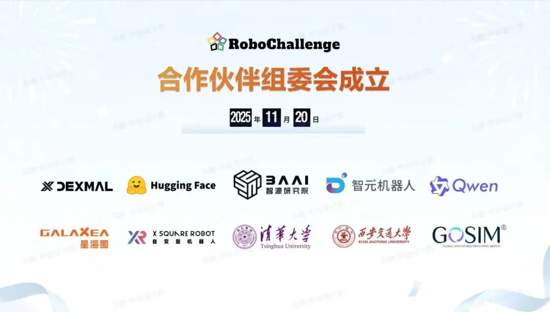 当下,人工智能技术正从“感知智能”迈向“行动智能”,如何科学、公正地评估机器人在真实物理世界中的真实能力,成为制约行业发展的核心命题。在 Dexmal 原力灵机与 Hugging Face 共同发起 RoboChallenge 之后,迅速在行业内引发强烈共鸣并吸引广泛参与。智源研究院、智元机器人、Qwen、星海图、自变量、清华大学、西安交通大学、GOSIM 国际国内合作伙伴进一步携手,共同推动生态建设,并于2025 年 11 月 20 日正式成立 RoboChallenge 组委会。这标志着具身智能真机测评的开源协作不仅迈入了标准化的新阶段,更以“开放共同体”的行业共创模式,为具身智能技术的落地与迭代注入新动能。