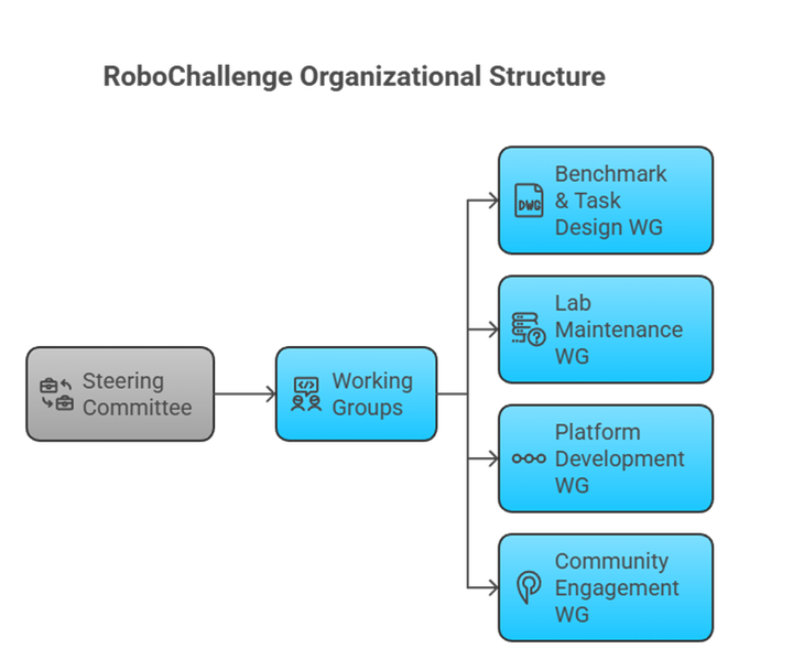 新成立的 RoboChallenge 组委会,将采用指导委员会(Steering Committee) + 工作组(Working Group)的双层架构,确保高效执行与透明治理;组委会作为决策中枢,遵循“开放、协作、共识”原则,统筹全局;下设四大核心工作组,作为具体落地的“执行引擎”。
