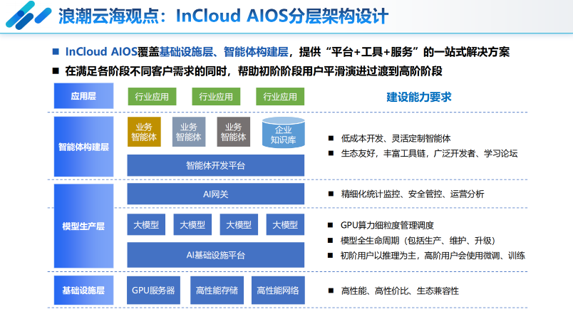 基于这一认知,浪潮数据将用户AI建设划分为三个阶段:入门型用户主要关注AI算力资源分配;进阶型用户需要建立稳定、高效的大模型服务;成熟型用户则需求统一的智能体开发平台。为满足不同阶段客户需求,AIOS平台采用分层解耦架构,包括基础设施层、模型生产层、智能体开发层和应用层四个层次。