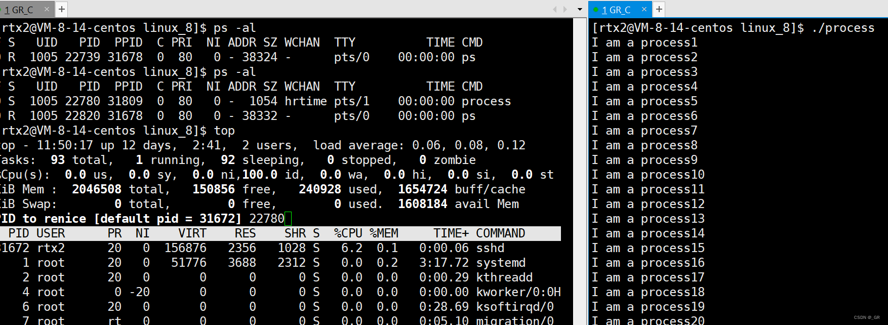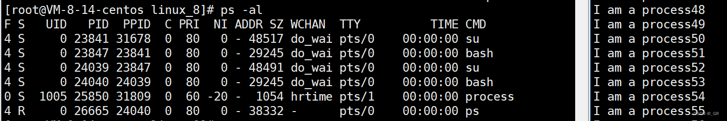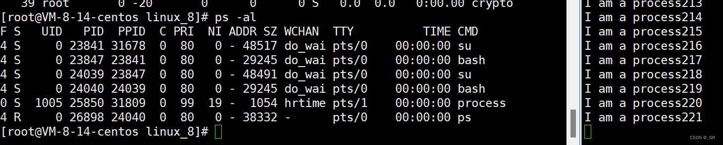 没反应是因为 ps -l 只能显示当前终端下进程的相关信息,然后输入了 ps -al就看到了当前进程。此时我们的进程 process 就显示出来了,我们重点关注 PRI和NI,上面是80和0