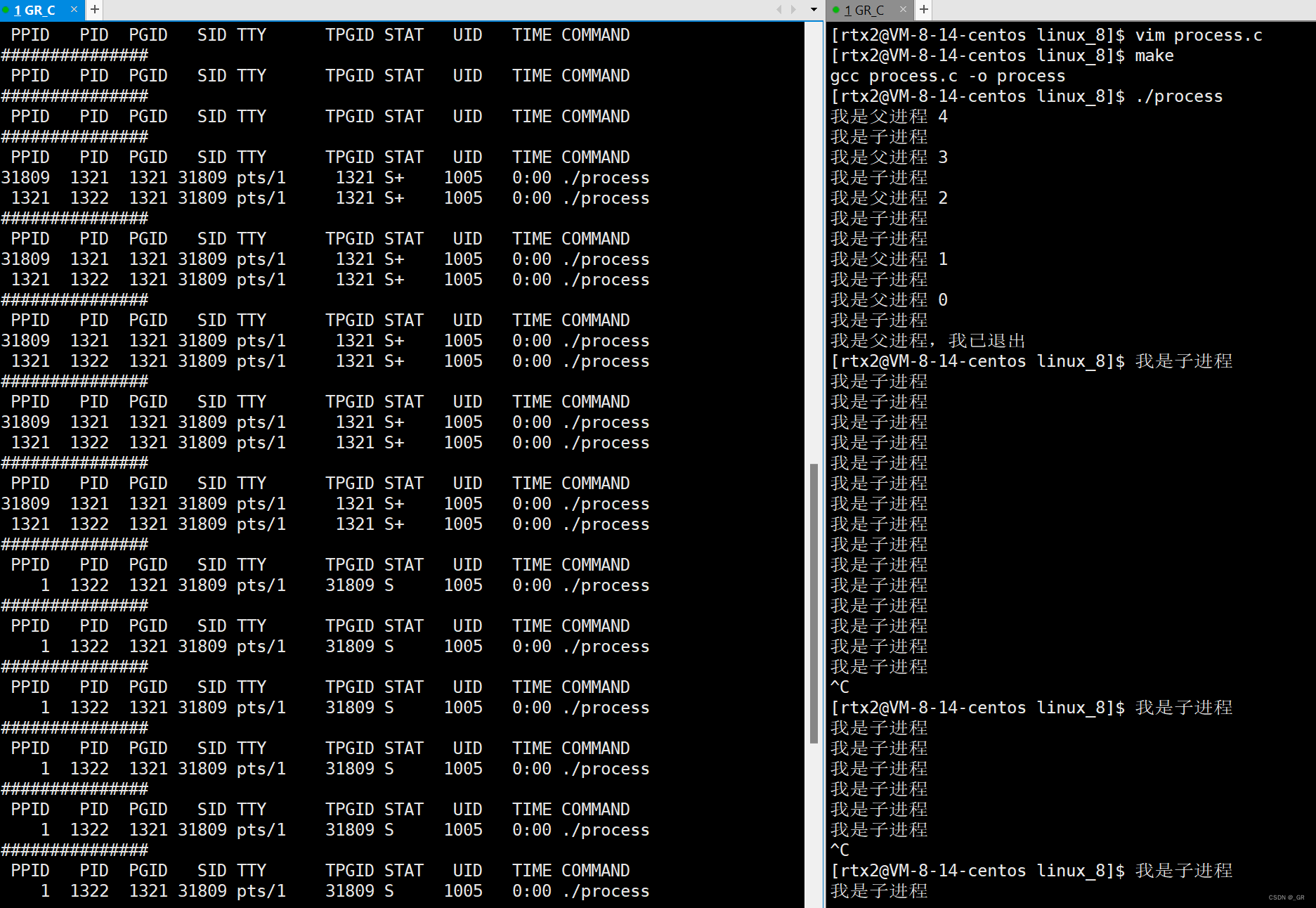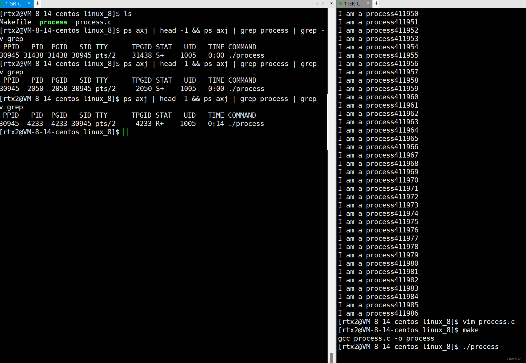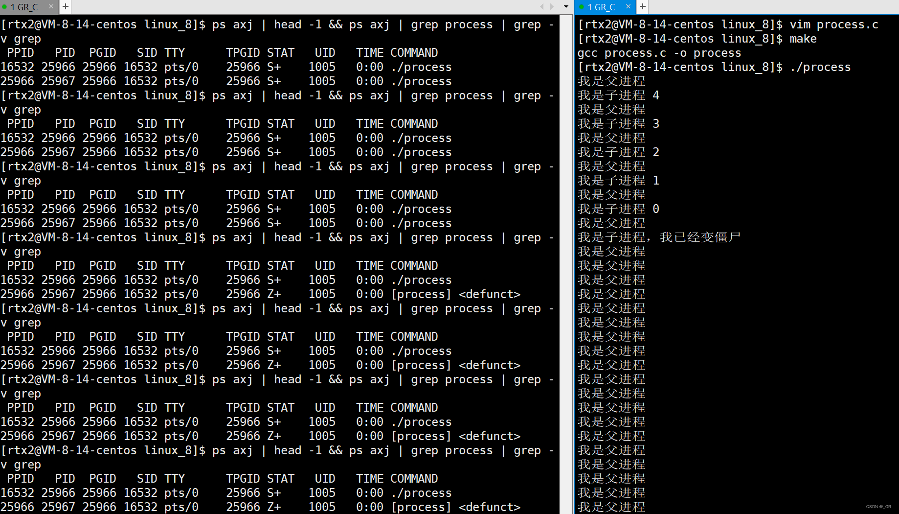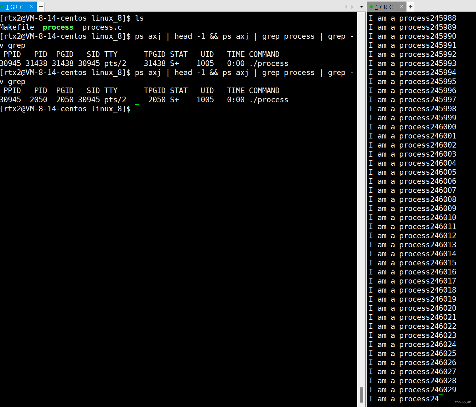 这里我们也能拿 ps 指令来看进程的状态,我们像上节课一个开两个窗口,一个运行代码,一个输入:ps axj | head -1 && ps axj | grep process | grep -v grep