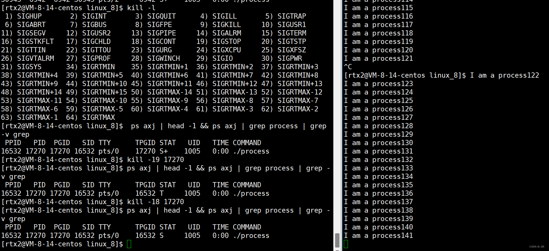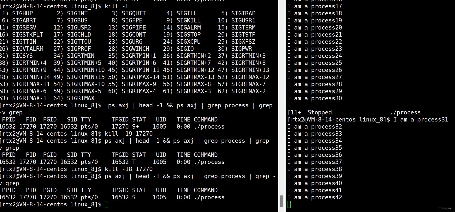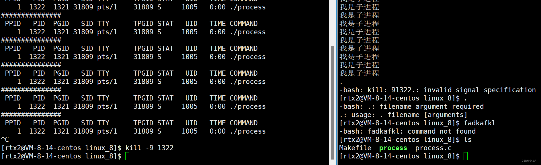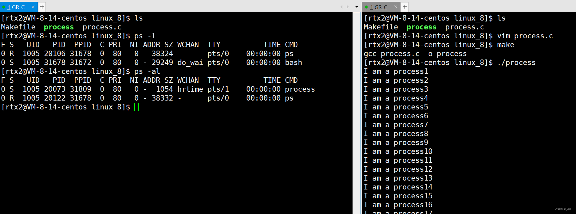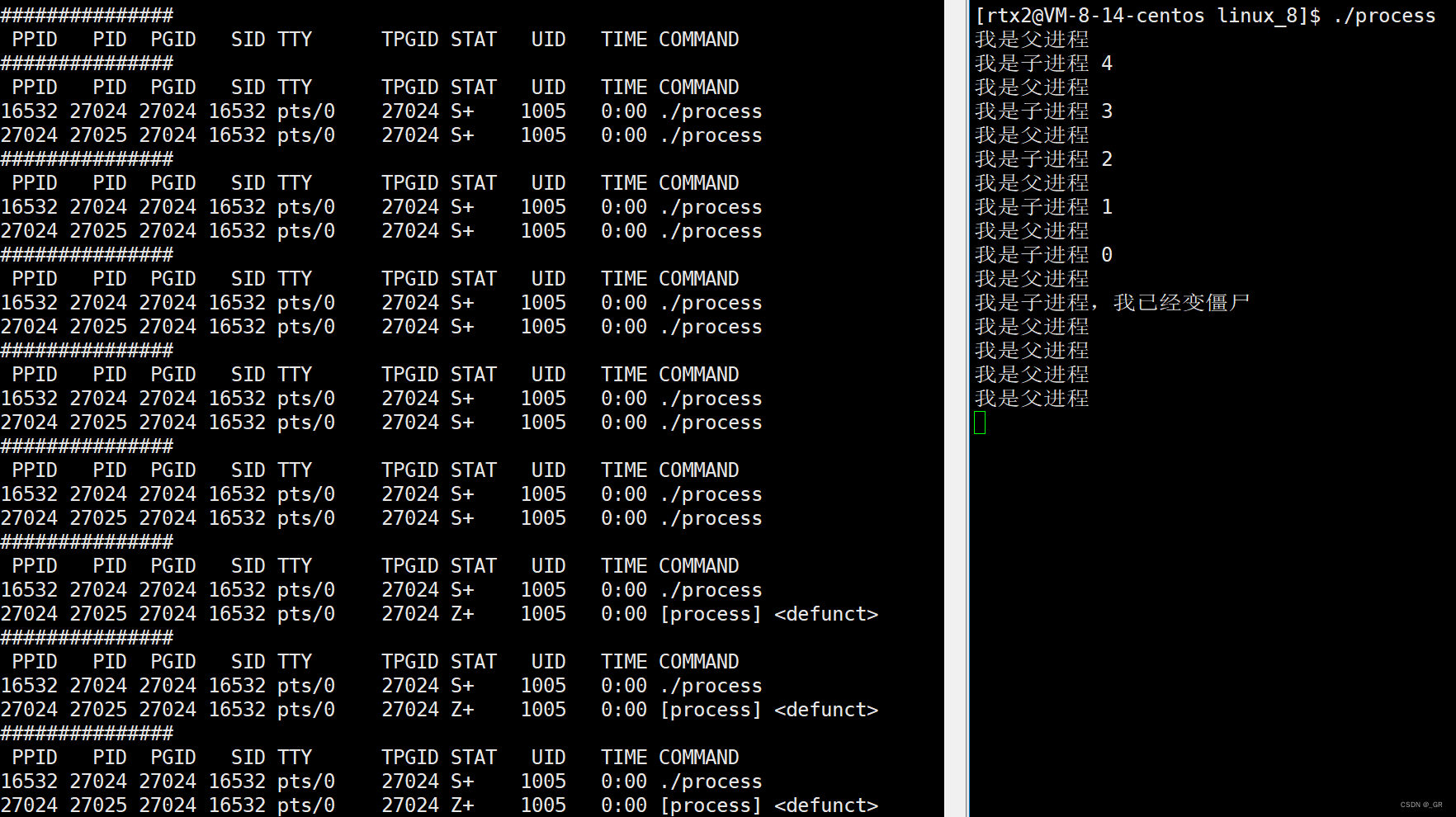 这里我们也能拿 ps 指令来看进程的状态,我们像上节课一个开两个窗口,一个运行代码,一个输入:ps axj | head -1 && ps axj | grep process | grep -v grep