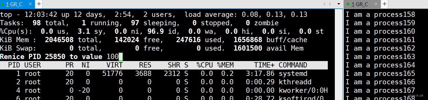 renice就是设置nice值,这里给-20看看:然后修改失败了:Permission denied (没有权限) ?前面说到:"一个进程的优先级不能轻易被修改,因为会打破调度器的平衡"。我们切换到在左边切换root用户重复上面的操作看看: