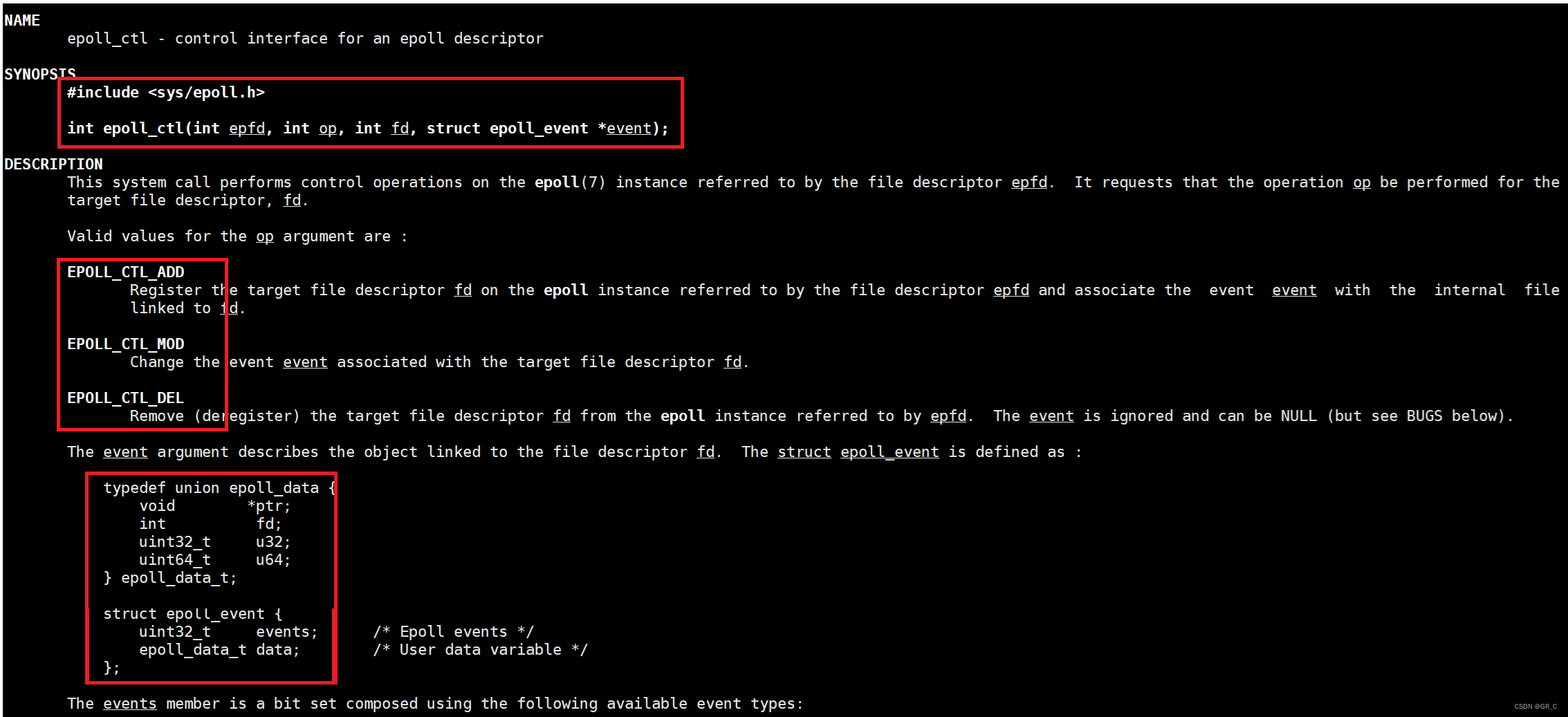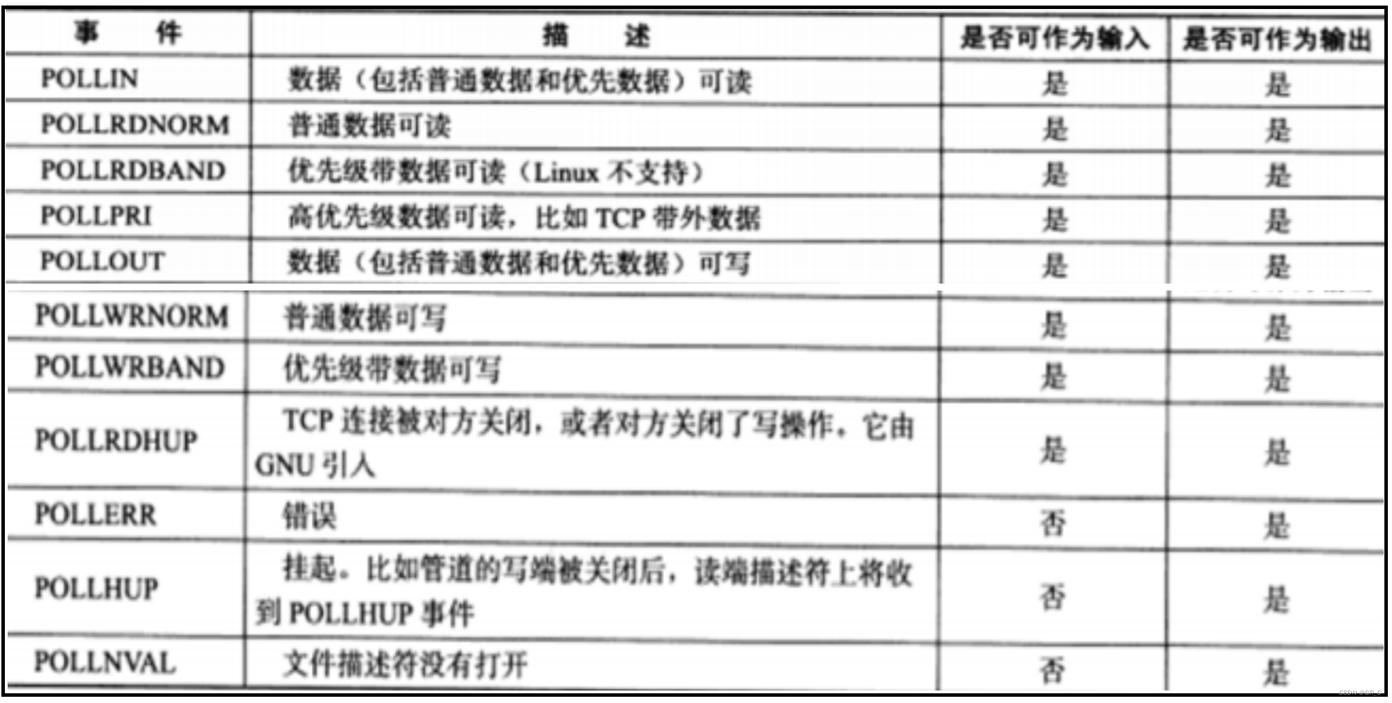 如上图所示便是用户层以及操作系统可以设置的事件类型,这些同样是一些宏定义,常用的就是POLLIN数据可读,以及POLLOUT数据可写。