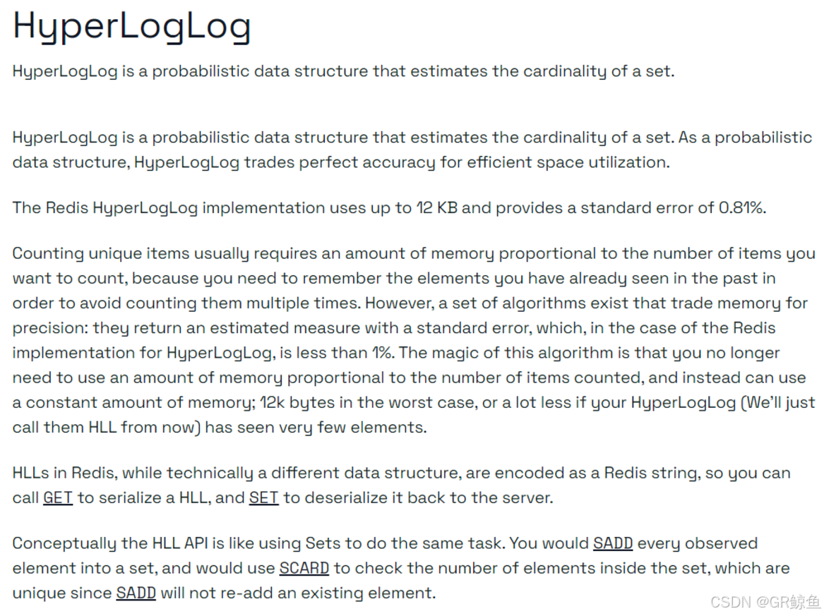 - 空间效率:HyperLogLog 可以仅使用大约 12 KB 的内存来估计超过 10 亿个唯一项目的基数,标准误差为 0.81%。与需要更多内存来存储所有独特元素的传统方法相比,这使得它具有高度的空间效率。