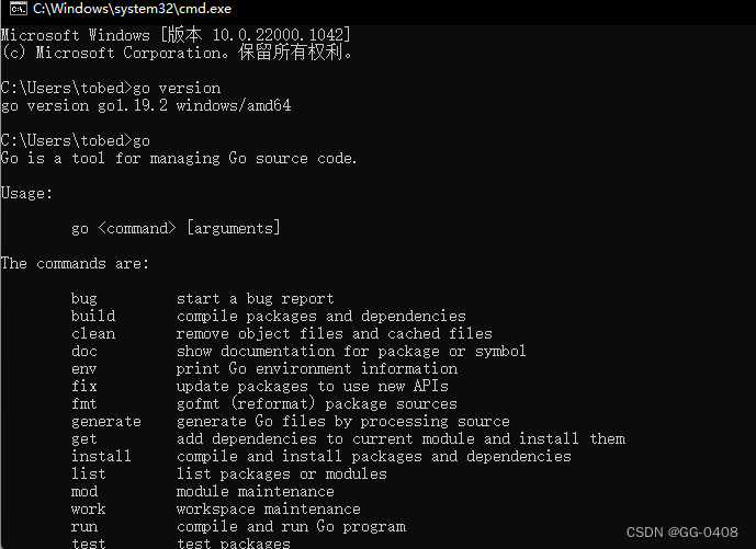 输入GO或者go version 查看配置和版本 显示及代表安装成功