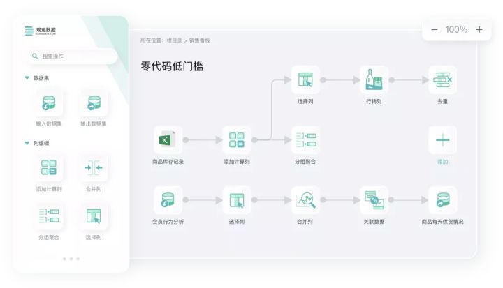 其开创的Smart ETL能够让不懂代码的业务人员自己上手整理并清洗数据,通过拖拉拽方式与配置选项,实现行列与字段的转换、筛选与清洗等,使数据处理端到端提速50%。
