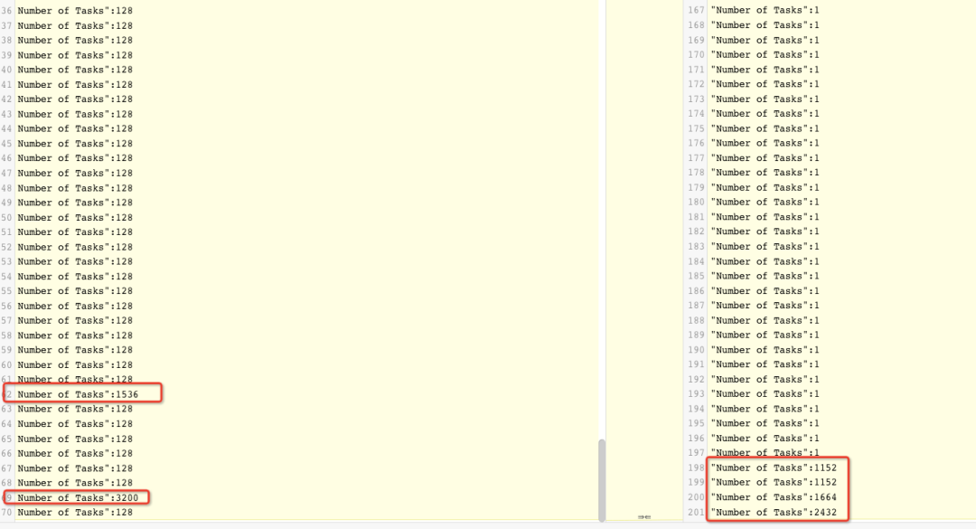 根据 JobGroupId 筛选所有的 SparkListenerStageSubmitted 事件,然后统计其中的任务数,发现老版本的 Spark 产生的任务数更多,每个 stage 大多有 128 个任务,新版本则大多是 1 个,最后几个 stage 有上千个任务。