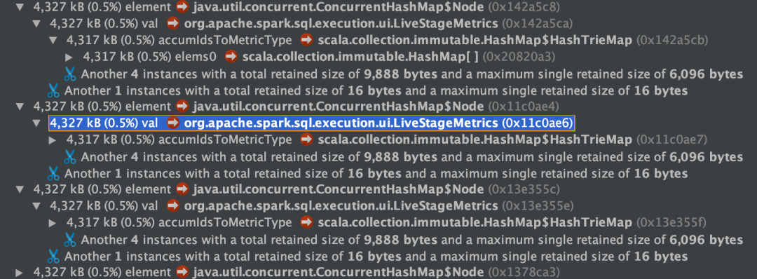 在 Spark 3.2 中,还存在着大量 内存大多数被 accumIdsToMetricType 占用的 LiveStageMetric 对象,大小是 2-5M 左右,而 Spark 3.0.1 则大多是几百 K。