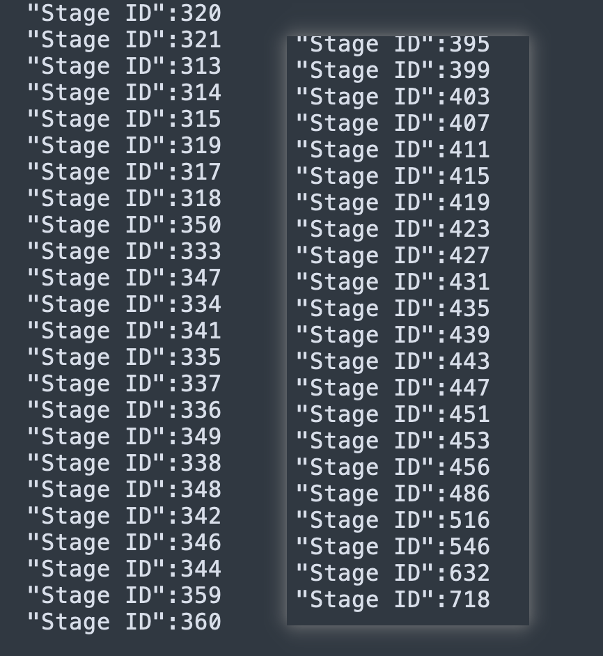 根据内存 dump 和 event log 的统计,这个 case 新版本生成的 StageMetrics 的数量相差了接近两倍,从 stageId 上也能看出新版本生成的最大 ID 序号(从 0 开始)也是两倍的关系,那么关注点就在不连续的这部分 ID 上面。在 eventLog 中对 stage Id 进行搜索,发现有些 stage 在 SparkListenerJobStart 事件中存在,但没有触发 SparkListenerStageSubmitted 事件,想必这就是 skipped stage。那 skipped stage 对 StageMetric 的影响是什么呢?