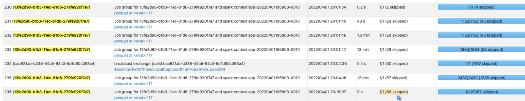 那么想来问题和数据也是有关的。在此之前,我在 Spark ui 上观察过出问题环境的 etl 运行,有几个比较明显的特点: