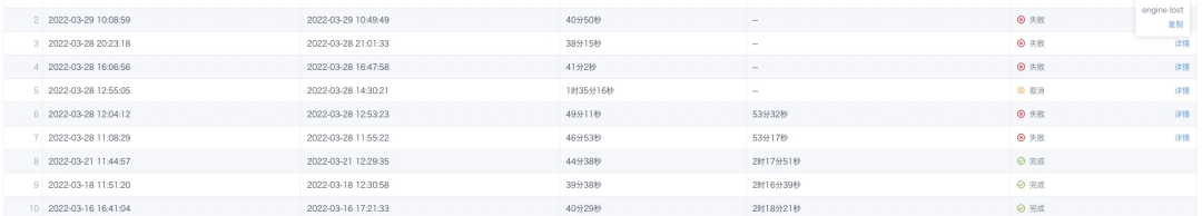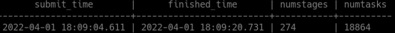 通过查询数据库中记录的 Spark 任务 metric 的统计,印证了我的观察。这个任务在 Spark 3.0.1 版本运行时会生成几百个 stage,上万个 task。在 Spark 3.2 中没运行成功,因此没有准确的统计数据。