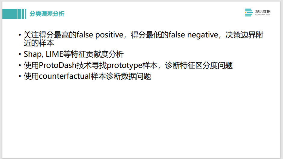 如果是分类问题其实也是一样。比如说你关注得分最高和得分最低的这些错误的样本,就是你最有信心的,但是它预测错了。另外决策边界附近预测是个50%可能性附近的一个样本,你也可以用SHAP去分析它的特征,看看是不是有些冲突的特征。就是a特征跟b特征其实是有一些冲突,导致他们的效果抵消了,最后模型就不太确定到底是一个正样本还是负样本。