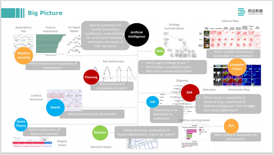 刚才讲的是可解释性机器学习,可以看到黄色这些框,比如机器学习,视觉或者NLP。如果是AI的话,它的范畴会更大些,比如像多智能体的一些系统,或者做一些运筹的优化,搜索优化或者planning,或者是一些跟知识表达和推理相关的东西,这些可能都是需要解释的。当在构建整个智能决策系统的时候,不光是算法,或者狭义的机器学习的部分需要给出一些解释,对于其他那些运筹优化,知识的推理和逻辑推理,或者在多智能环境下的强化学习的策略的选择,也需要给出一些解释。或者是帮助你去改进模型,帮助你的业务方、受众方去理解你为什么做决策,都是很有帮助的。