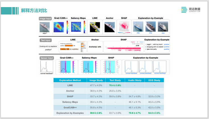 前面讲了很多解释方法,我们再来看一下解释方法的对比。最上面是图像类型的解释。比较了Grad-CAM等类似于显著图的方法,还有像LIME、SHAP,最右边这种通过 example数据的实例来进行解释,中间是text的一些任务,最下面是一个时间序列的input,它分别通过不同的方法来做解释。然后把这些解释的方法放到了亚马逊的 Mechanical Turk众包平台上去,让人工来评判到底哪种解释比较好。可以看到接受度最高的是Explanation by example。这个也给我们一个启示,如果解释是用于这种业务系统,或者需要像业务方式进行解释的话,使用样本解释的方式更好。但如果作为开发者的话, Shapley可能会更有用些。
