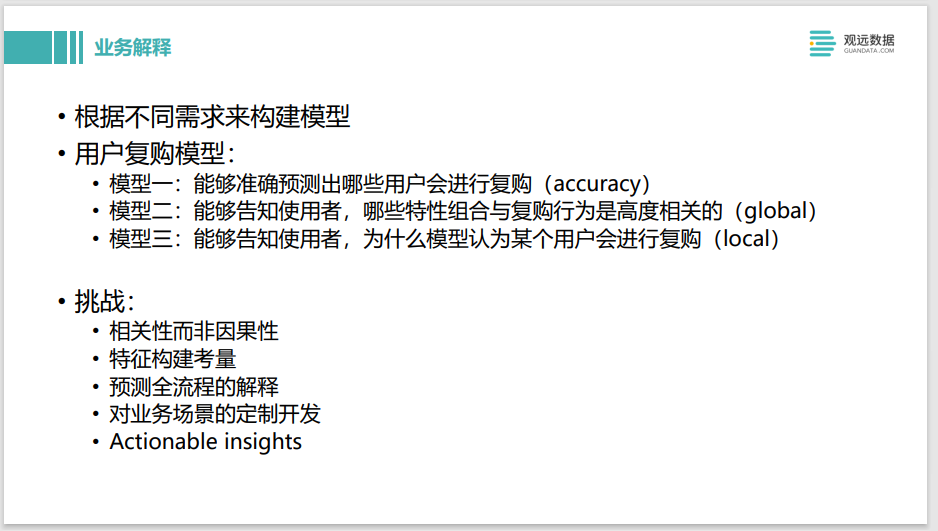 模型二是能够告知哪些特性的组合与复购行为是高度相关的,这是一个全局性的解释的例子。就是把insights提供给业务方,业务就知道需要去做哪些事情,可以让用户的复购率提升。对他们来说是一个业务上的指导。我们可以选择一些相对简单的,比如决策树、线性回归就可以了。