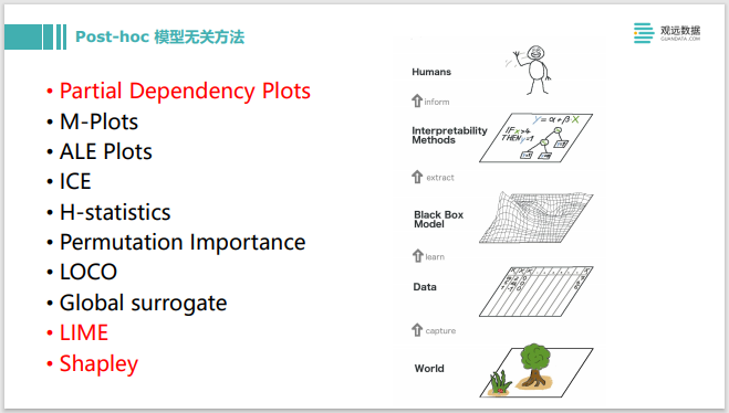 除了神经网络模型之外,还有一大部分像树模型、 Gradient Boosting这些,其实都可以用一些 Post-hoc模型无关的方法来做一些解释。大致流程是,当有了一个 Black Box Model之后,可以用一些解释的方法,去最终给用户输出一些说明。我们重点讲一下 PDP、LIME和Shapley。