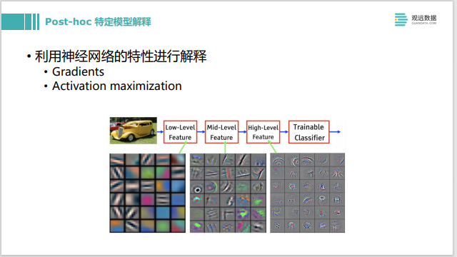 还有像神经网络,大多是在训练模型完成之后事后解释。我们利用神经网络,去计算它的梯度然后做一些反向传播,去做一些解释。上图是早年研究中我们怎么来理解 CNN模型它学到些什么,可以通过改变它的输入,去让它的每个CNN filter的 activation最大化。这样就可以看到,前面几层 CNN的层能学到边缘,中间的能学到一些形状,再高些能学到一些概念。这个其实就是利用了神经网络的求梯度,然后做反向传播的原理,来做一些解释。