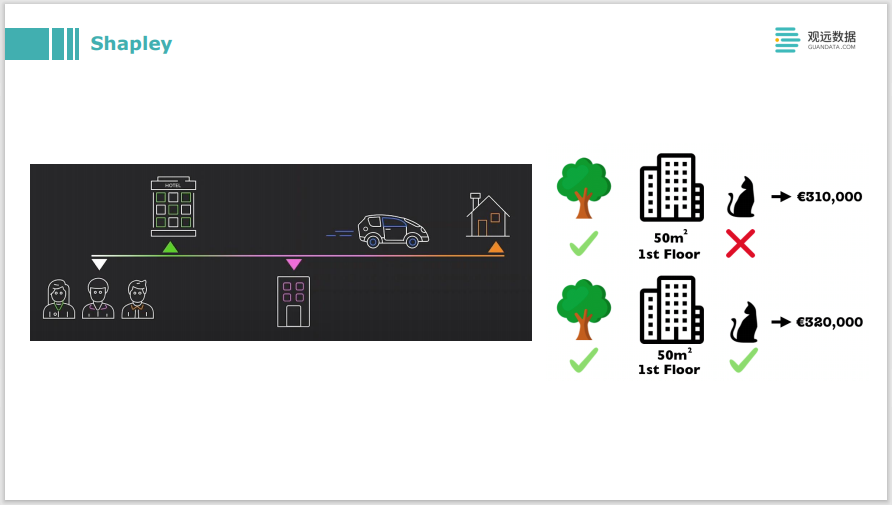 Shapley背后的原理是博弈论的一个理论。比如上面这张图,要解决的问题是,三个人去拼车,三个人在不同的地点下车,那么最后车费应该怎么均摊?迁移到机器学习解释的问题就是,最后总的车费是模型的预测输出,每个人要付多少车费就是三个特征的贡献度。这背后有一套很复杂的运作逻辑,去把各个特征的 attribution算出来,也就是一个 local的解释,对每一条预测样本都做出一些解释。
