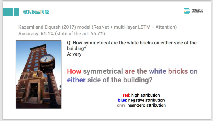 下面这个例子也是类似的,它也是用了IG的方法。这是一个VQA - Visual Question Answering看图问题的任务。这个问题是在图片中 white bricks有多对称。模型给出的回答是very,它是很对称这个回答是很make sense的正确回答。但是我们用了技术去对它进行了分析之后,发现红色的文字具有很高贡献度,蓝色的是比较有负面贡献度,灰色的几乎是没有什么贡献度的,所以其实模型给出的这个回答预测,其实它是重点关注在这个How上面,所以关注度是有问题的。