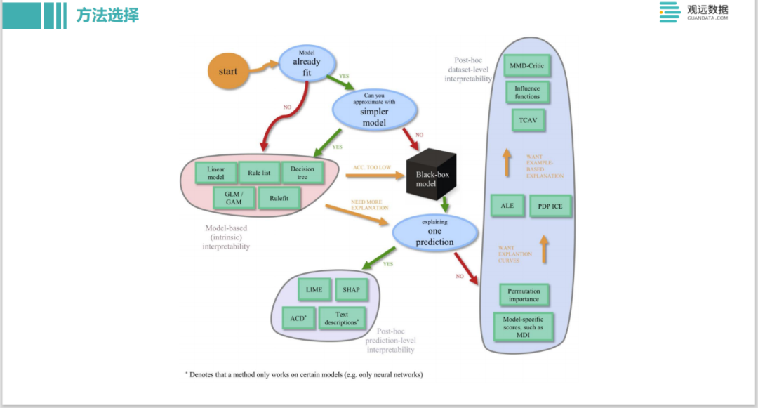 这也是推特上的一个对模型解释的方法选择。包括你能不能接受精度比较差的模型,是不是需要做全局的解释,还是 local的每一条instance的解释,列了一个类似于决策图,也可以根据这个来选择。