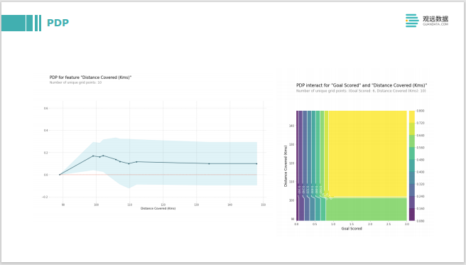 PDP的思想就是去修改特征值。把一个特征值在模型训练完后,有了黑色模型,再输入的时候,把它的特征值做一些修改,比如从0改到100,去看下模型的输出是什么样子。跟what-if的分析非常类似,去看它的输出跟随特征变化会有什么样的变化。右边这张图,是两个特征的交互,两个特征分别做修改,去看它整体对模型输出的影响。