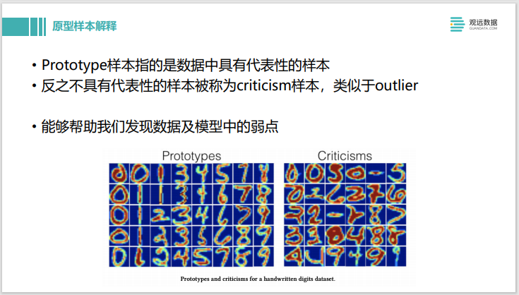 接下来是原型样本解释。Prototype是数据中具有代表性的样本,反之,如果不太具有代表性,就称为Criticism,类似于outlier,这种方法它能够帮我们发现数据和模型的缺点。举个例子,我们训练的一个CNN模型做物体分类识别,prototype是一些正常的照片,Criticism里面发现了一些晚上光照不好拍的照片,如果这些照片分类为Criticism,就说明我们的数据集中可能对于夜间拍摄的照片的数量不够。这个模型在这部分的数据准确率比较差需要加以改进。