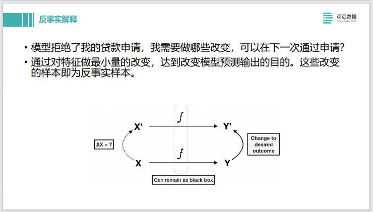 下面讲下反事实解释。比如模型对贷款申请的模型进行判断,输入数据后它拒绝了贷款申请。Shapley的反事实解释就是,需要在特征值上做哪些改变,可以在下一次就通过申请,预测的 label会从0变成1,这就是一个反事实解释。