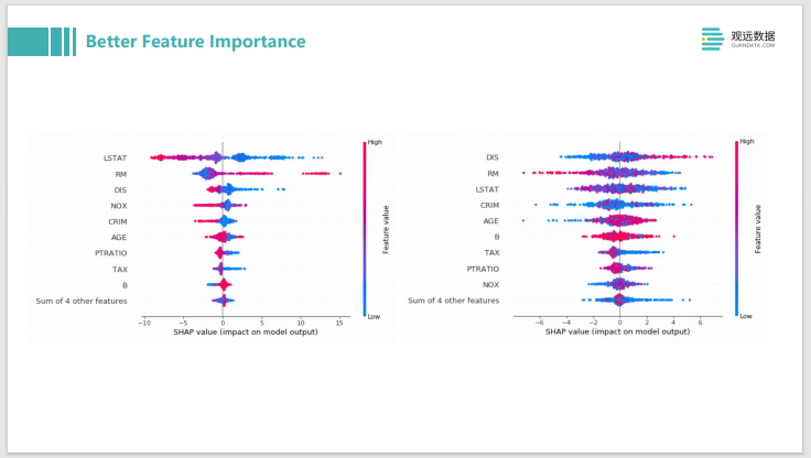 比如它的这个线比较粗的话,就是一个圆锥形的分布,数据量比较多;比如蓝色的是一个特征值是比较低的情况,红色的是特征值比较高的情况。左图是一个训练的比较好的模型,你大致看到大多数的特征,它在 Feature value高和低的时候,它可以把红色是负面影响,蓝色是正面影响明显的区分,它基本上可能都可以分开来。