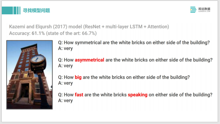 因此如果我们把中间 symmetrical换成别的词,比如asymmetrical,是不是不对称的,或者how big有多大,甚至改成一句完全没有什么含义的话。White bricks speaking, how fast,它回答是very。这样就帮我们发现了这个模型的问题,它其实没有真正的去理解这句话和图片,但是它看似给出了一个很好的预测,这样也是帮我们发现模型的一些问题。