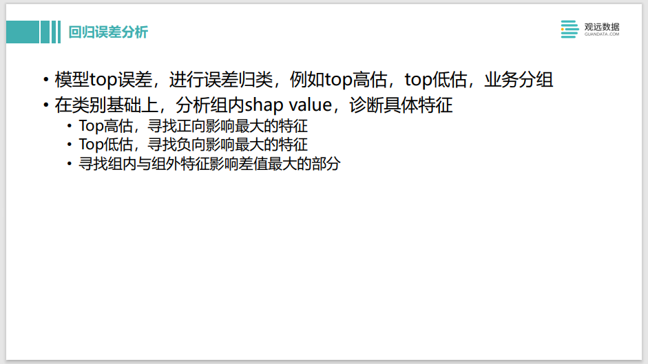 那么如果是回归问题的话也是类似的。比如可以找Top高估的那些预测样本和Top低估的预测样本,然后分别去在组内做一些SHAP value相关的一些分析,去看下TOP高估的那些,它的正向影响的最大的特点到底是哪些。如果是有问题的特征,我们可以做一些针对性的分析,如果是特征区分度不够高的话,可能要增加一些新的特征进去。Top低估点,也是类似的做法。