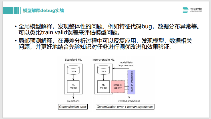 有了模型解释工具之后,可以帮助来改进这个流程。当有了结果之后,可以用模型解释工具,对预测不太好的一些条目进行解释。看一下用的特征是不是符合预期,如果不符合,可以把人工经验植入到模型的构建流程中去。通过模型解释发现问题之后,跑了一轮新的训练,出了一个新的结果,这个时候还可以继续用解释工具去验证改进是不是有效。做实验时,除了过拟合和欠拟合这种很直接从指标上看到的,其他一些更细节的问题,有了模型解释工具之后是很有帮助的,会帮你加快迭代速度,而且很好的把人工业务经验融入进去。