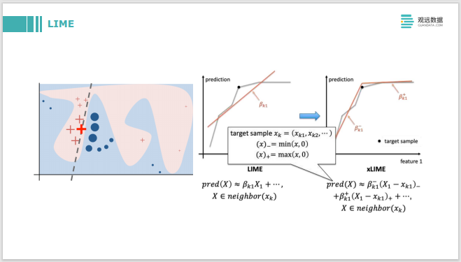 LIME是一个局部解释的方法。对每一个 instance都做出单独的解释,它的做法是在instance附近做些采样。左边这张图,是要解释红色加粗的加号,首先在它周围采了很多样本,在局部样本周围采样之后构建一个线性模型。线性模型对各个特征的系数本身就是可解释的。包括旁边在LIME基础上还有xLIME,它是对这个特征从小变到大,从当前这个点到更大的方向,构造两个线性模型来做解释。