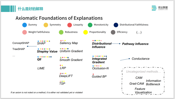 最近 AAAI 2021年的tutorial从数学性质上总结了一系列的好的解释的性质。上面是各个解释的方法它拥有这些性质的多少,数量比较多的两个是 Shapley Value和Integrated Gradient。这两个方法如果用神经网络的话,可以用 IG,如果用一些传统模型,Shapley Value也是一个非常好的选择。