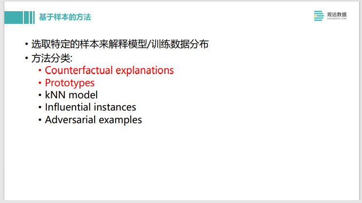 接下来讲下基于样本的一些方法。基于这个样本得出的这个预测,那么怎么来解释它呢?就是去找一条跟它类似的样本,或是找一条具有代表性的样本,然后去解释这个模型的行为,或是解释训练数据它其实就是这么分布的。这个方法要有反事实的方法,或prototypes原型方法,还有像 adversarial对神经网络的攻击方法。