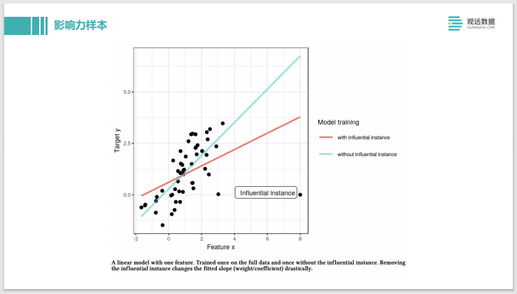 最后这个是影响力样本。相当于原先有全量数据去训练,它会拟合出这条红色线的信息模型。当把右下角这个离其他的点非常远的 influential instance去掉之后,它就拟合出来新的蓝色这条线了,可以看到斜率改变非常大,所以就可以叫右下角这个点是一个influential instance ,就是很有影响力的样本。但这个方法也有些效率上的问题,是和Shapley的原理差不多,要考虑每一个样本的影响力,要把每一个样本去掉,重新训练一个模型来看,开销很大。也有些其他方法,像在神经网络模型上,可以快速在一个构建好的模型上去寻找它影响力样本,还有像集成树模型也有方法是可以快速找到影响力样本。